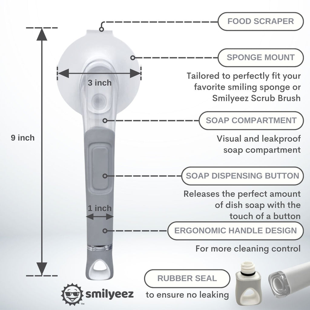 It makes cleaning with the smiling brush easier and more fun. Keep Hands dry with Easy to hold handle. Easy to fill soap dispenser.